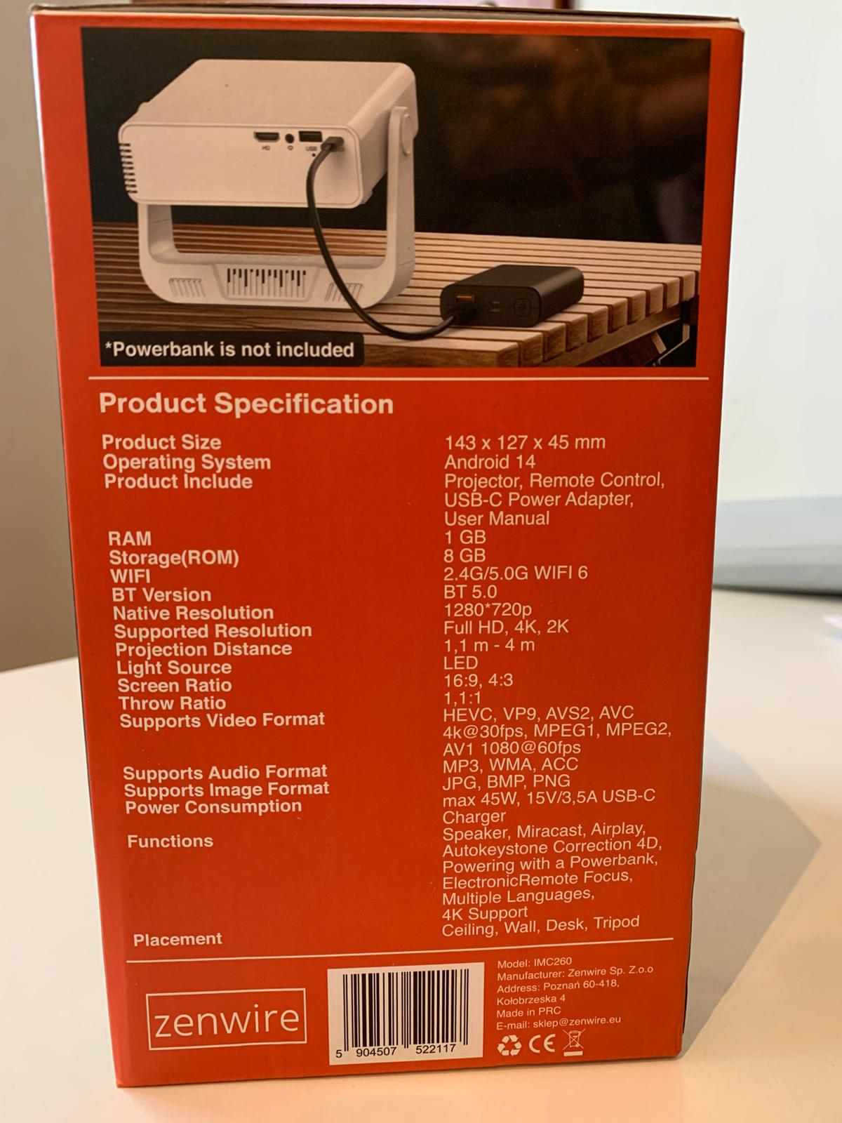 Iščete prenosni projektor? Ali morda cenovno dostopno napravo visoke kakovosti in vsestranske uporabe? Z Zenwire PrimeView IMC260 boste dobili vse, kar potrebujete, v enem projektorju. Projektor z Android 14, WiFi, HD kakovostjo, podporo 4K, svetilnostjo 350 ANSI, vrtljivim tečajem, avtomatskim prilagajanjem slike in elektronskim ostrenjem. Poleg tega ima vgrajen USB-C 45W priključek, ki omogoča napajanje projektorja iz Power Banka in USB-C napajalnika. Vse to je zaprto v lahkem in kompaktnem ohišju, ki omogoča enostavno prenašanje.