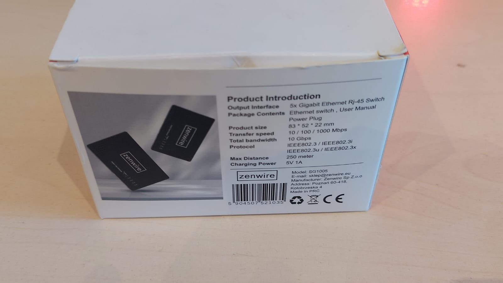 Stikalo je opremljeno s 5 gigabitnimi vrati RJ45 in lahko prenaša podatke z največjo hitrostjo 1000 Mb/s (1 Gb/s) na vrata