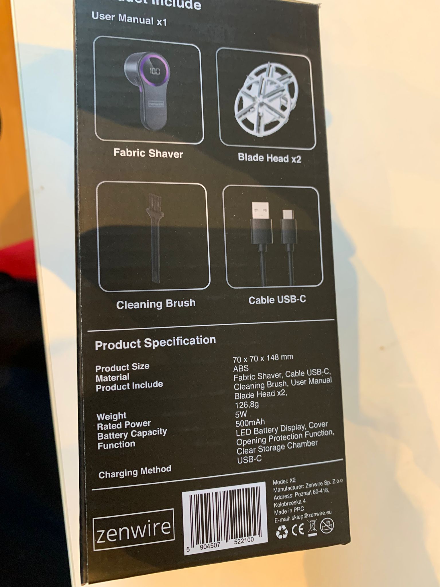 Vsebina paketa: odstranjevalec muck Zenwire ShineCore X2, 2x rezalna glava (6-krilna rezila iz nerjavnega jekla), čistilna ščetka, polnilni kabel USB‑A na USB‑C, prozorna posodica za vlaknine, navodila, originalna embalaža.