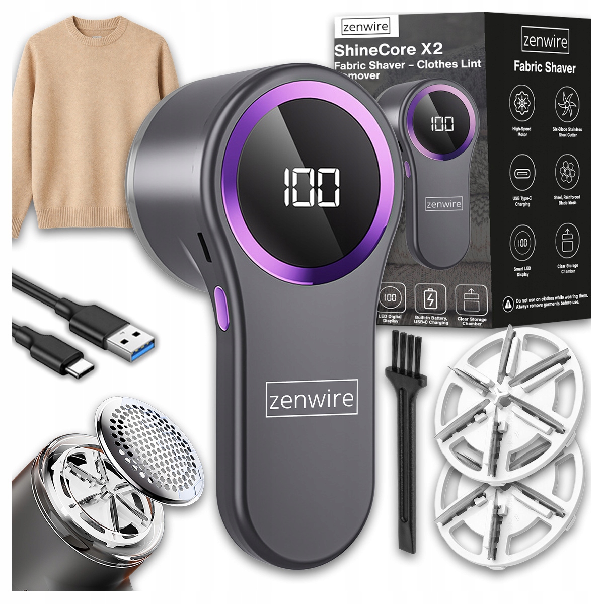 Zenwire ShineCore X2 je kompaktni električni odstranjevalec muck, zasnovan za hitro osvežitev videza oblačil in različnih tekstilij. Učinkovito odstranjuje mucke, vozličke in vlakna s puloverjev, plaščev, odej, pregrinjal ter tudi z oblazinjenega pohištva, pri tem pa je zasnova varna za tkanino, saj so rezila zaščitena z ojačano kovinsko mrežico.