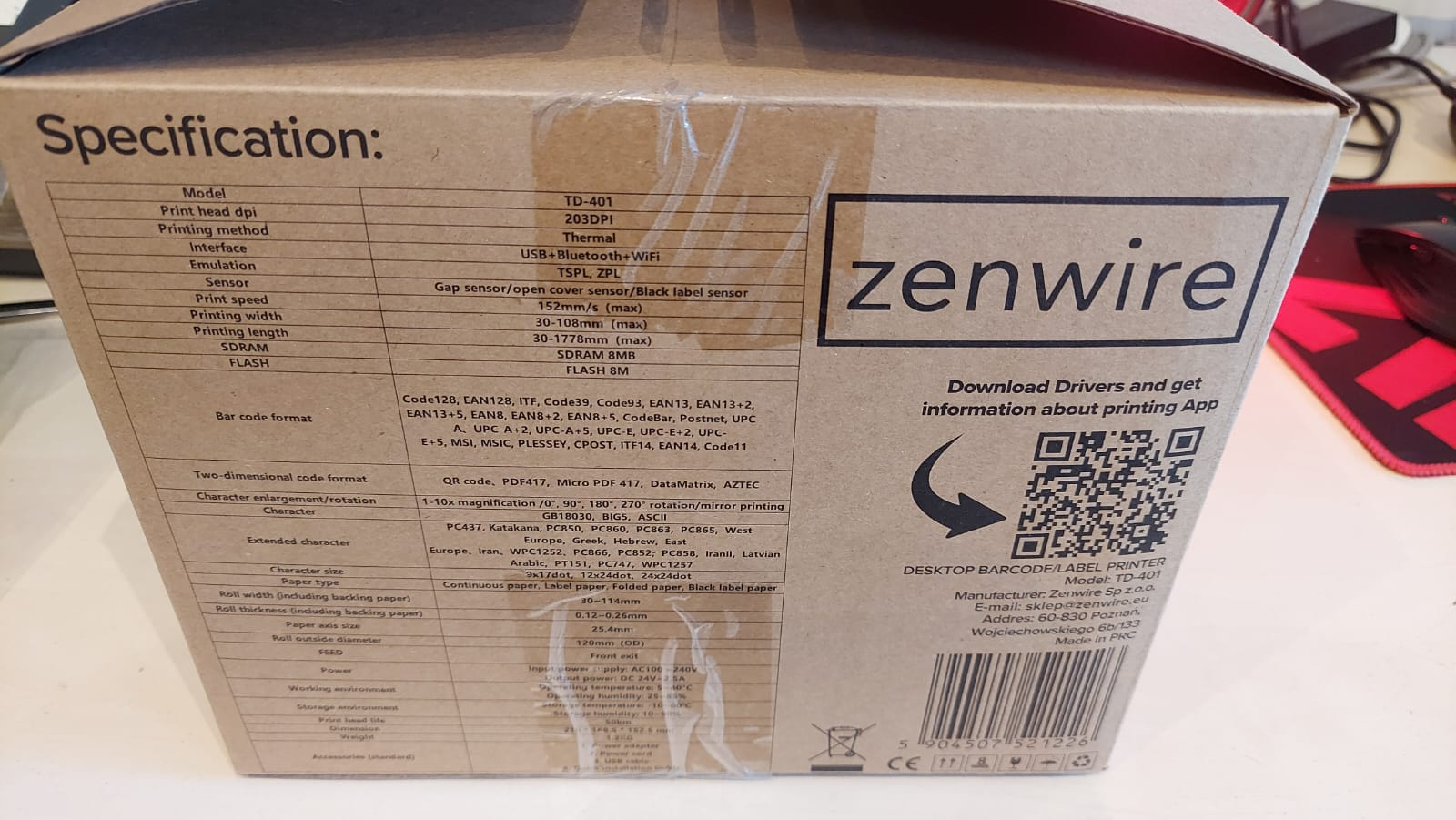Zenwire® TD-401 je kompakten termalni tiskalnik z ločljivostjo 203 DPI in hitrostjo tiskanja 152 mm/s, ki je idealen za tiskanje nalepk, računov in črtnih kod. Tehnologije Wifi, Bluetooth in USB z dostopom do namenske programske opreme in aplikacij omogočajo številne možnosti povezljivosti. Zaradi napredne termične tehnologije ni potrebno črnilo ali toner, kar zmanjšuje tekoče stroške. Tiskalnik je združljiv z operacijskimi sistemi Windows, macOS, Android, Mac Os, iOS in Linux, zato je vsestranska rešitev za vse uporabnike. Originalni izdelek evropske (poljske) blagovne znamke Zenwire .
