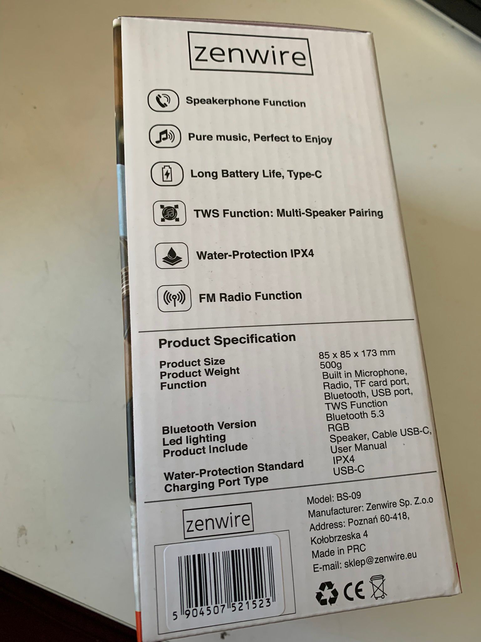 Zvočnik Zenwire Vibe BS-09 Bluetooth 5.3 z močjo 26 W je popoln spremljevalec tako doma kot na poti. Z zmogljivim zvokom z jasnim 26W maksimalnim zvokom in globokimi basi lahko kadar koli uživate v svoji najljubši glasbi. Baterija s kapaciteto 2500 mAh zagotavlja do 5,5 ure predvajanja, zaradi odpornosti na pljuske IPX4 pa je zvočnik idealen za dež ali dejavnosti na prostem. Sodobno, robustno ohišje s svetlobnim učinkom RGB LED ustvari edinstveno vzdušje in izboljša ritem glasbe, vgrajeni radio FM ter možnost sprejemanja telefonskih klicev in branja s kartic SD pa ga naredijo še bolj praktičnega. Izberite Zenwire Vibe BS-09 in združite slog, moč in funkcionalnost v eni napravi.