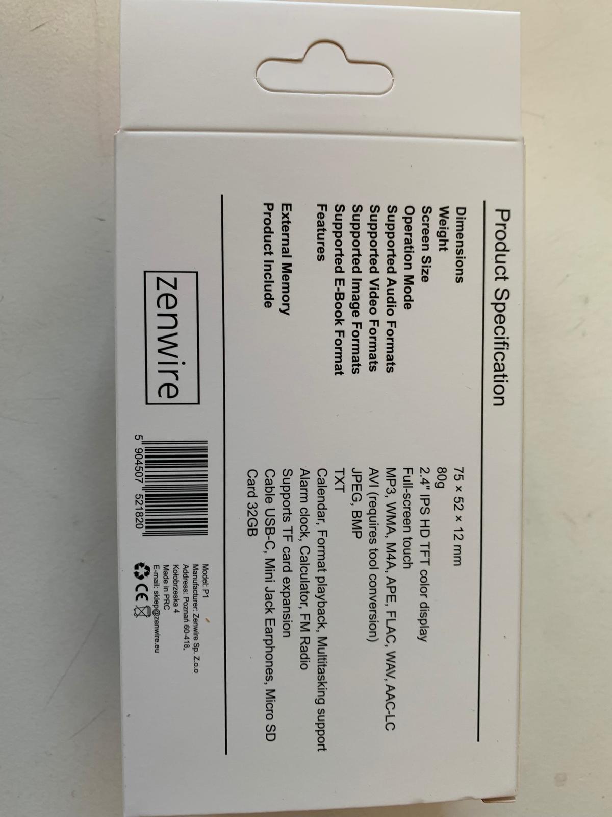 Zenwire Vibe P1 je kompakten, večnamenski prenosni predvajalnik za glasbo, avdio knjige in video vsebine. Združuje kakovostno aluminijasto ohišje s steklenim hrbtom, jasen 2,4-palčni IPS zaslon na dotik in sodobno povezljivost Bluetooth 5.2. Zaradi skupne kapacitete 36 GB (4 GB vgrajeno + priložena 32 GB microSD) je pripravljen za uporabo takoj, brez dodatnih nakupov.