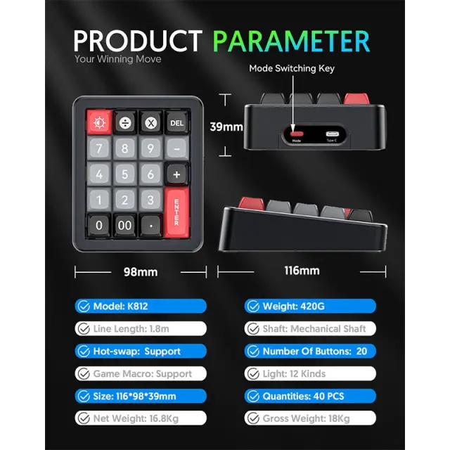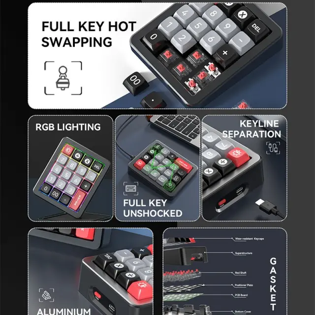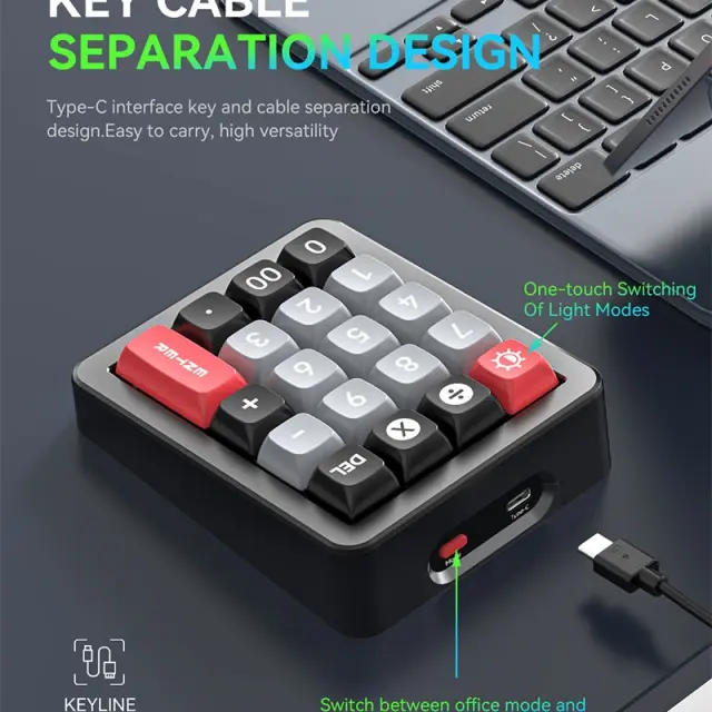 Prilagodljiva in vsestranska: Ta 20-tipkovna makro igralna tipkovnica ponuja obsežne možnosti prilagajanja, ki ustrezajo vašim individualnim potrebam. RGB osvetlitev lahko prilagodite za ustvarjanje personalizirane estetike, medtem ko lahko makro tipke programirate s kompleksnimi ukazi za različne aplikacije. Priložen 1,8-metrski kabel Type-C zagotavlja stabilno in zanesljivo povezavo, medtem ko zasnova ločevanja ključnih linij izboljšuje prenosljivost in upravljanje kablov. ABS ohišje in sublimacijske tipke zagotavljajo udobno in dolgotrajno izkušnjo tipkanja. Združljiva z Windows, macOS in Linux, ta tipkovnica je primerna za igranje iger, programiranje in splošno uporabo.
