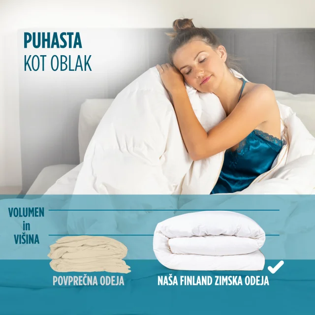 Zimska odeja Finland je neverjetno topla odeja, ki je kot nalašč za zimske noči in jesenske noči z nizkimi temperaturami. Odeja z bogatim volumnom je zasnovana posebej za tvoj globok spanec v objemu razkošnega perja in puha. 100 % naravni materiali ti nudijo odlično zračnost v vsakem trenutku noči. Tvoja koža bo v stiku z naravnimi materiali, saj je prevleka odeje izdelana iz mehkega bombaža. Reci "lahko noč" hladnim temperaturam in "dobro jutro" prijetni toploti pod odejo.
