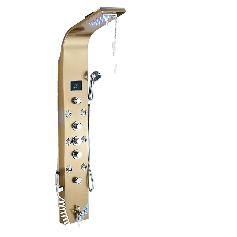 Eleganten dizajn: Sodobni slog tuš panela in eleganten zlat zaključek dodata luksuzen pridih vsakemu kopalniškemu dekorju.