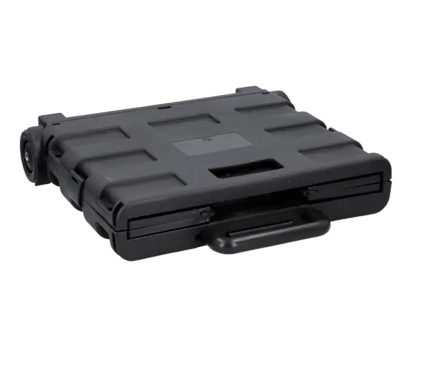 Na primer, zlahka ga vzamete s seboj v avto. Zaboj in voziček sta izdelana iz trpežne plastike in aluminija. Voziček ima 2 kolesi iz trde gume s premerom 7,5 centimetra.