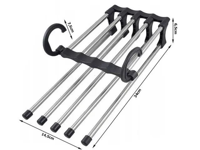S svojo kompaktno in prostorsko varčno zasnovo vam omogoča, da maksimirate prostor v omari ali garderobi. Obešalnik je opremljen z 5 posebnimi ročaji, na katere lahko enostavno obesite hlače brez zdrsa ali gubanja.