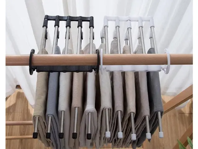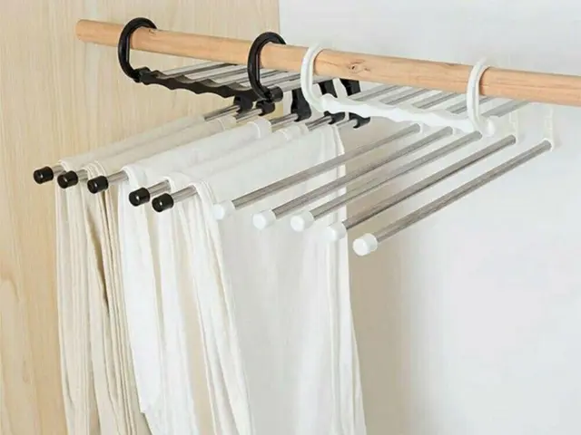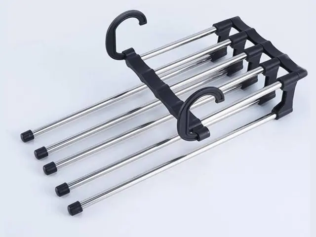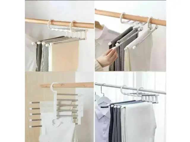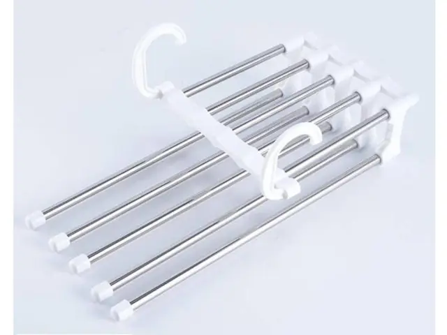 Obešalnik za 5 parov hlač je posebej oblikovan obešalnik, ki omogoča obešanje petih parov hlač hkrati, kar prihrani prostor v vaši garderobi ali garderobi. To je zelo praktična rešitev.
