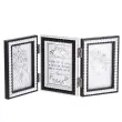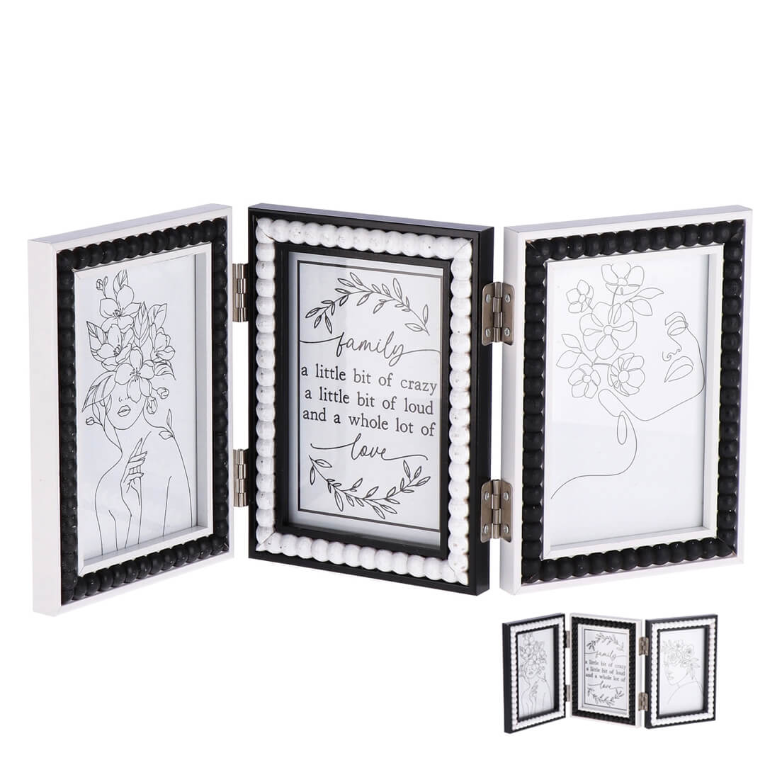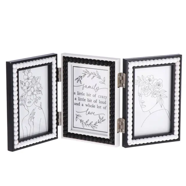 Zložljiv okvir je izdelan iz MDF materiala in je zasnovan za tri fotografije ali umetniške motive, pri čemer vsak del okvirja vključuje prostor za eno sliko dimenzije 10x15 cm. Obrobljen je z majhnimi kroglastimi detajli v črni in beli barvi, ki okvirju dajejo zanimiv kontrast in teksturo. Tečaji omogočajo, da se okvir postavi na različne načine, kar je idealno za postavitev na police, mize ali kot dekoracija na komodi.