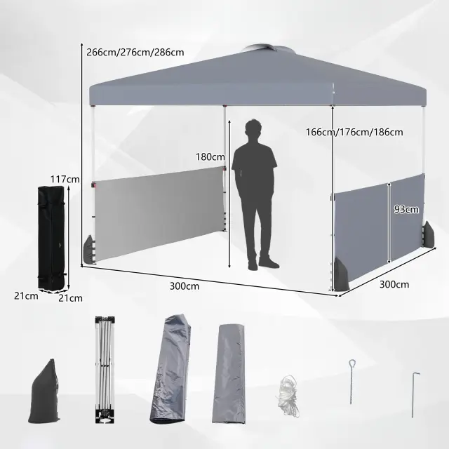 Zagotovite si zanesljivo zavetje za svoje pustolovščine na prostem! Naš izskočni šotor za gazebo meri 300 x 300 x 266-286 cm (D x Š x V) in ponuja 3-stopenjsko nastavljivo višino ter 2 odstranljivi polovični stranski steni, da se prilagodi osebnim željam. Njegova inovativna pop-up struktura omogoča hitro postavitev, ko ga ne uporabljate, pa ga lahko preprosto zložite in shranite v prenosno torbo s kolesi. Za izboljšano odpornost proti vetru je šotor gazebo opremljen z 8 kovinskimi žeblji, 4 kovinskimi sidri, 4 vrvmi proti vetru in 4 vrečkami s peskom. Poleg tega je gazebo izdelan iz visokokakovostne tkanine Oxford s srebrnim premazom in zagotavlja vrhunsko zaščito pred soncem in dežjem. (Opomba: Prosimo, da se izogibate uporabi v dneh z močnim dežjem ali močnim vetrom).