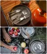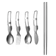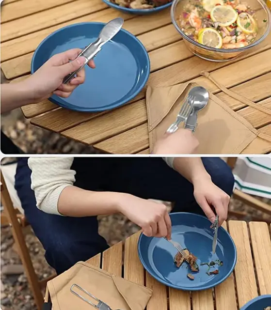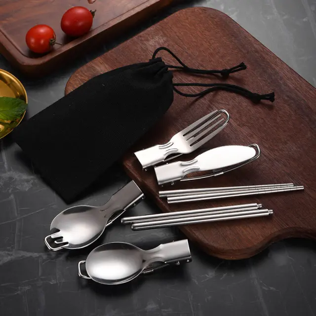 Jedilni pribor vključuje vilice, nož, žlico, špork in par palčk. Zložljiva oblika, enostavna za prenašanje in shranjevanje. Izdelan iz nerjavečega jekla, primernega za živila, močan in vzdržljiv, kot nalašč za kampiranje, pohodništvo in drugo.