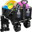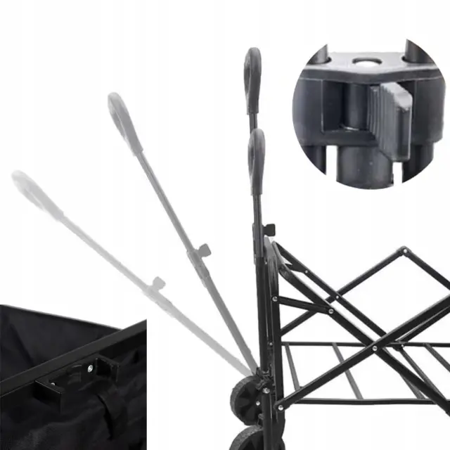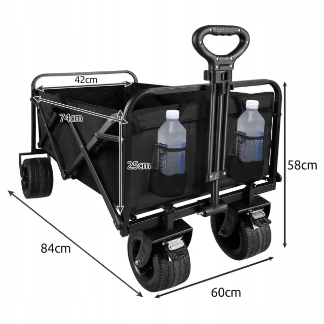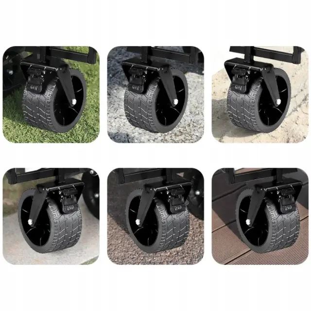 - ŠIROKA OBRAČALNA KOLESA – voziček je opremljen s širokimi pohodnimi kolesi iz visokokakovostnega PP materiala, ki zagotavljajo stabilnost in enostavno manevriranje na različnih podlagah. Kolesa na sprednjem delu vozička so vrtljiva za 360 stopinj, kar omogoča natančen nadzor in enostavno manevriranje v ozkih prostorih. Imajo tudi zavore / ključavnice, ki zagotavljajo varnost in stabilnost med nakladanjem in razkladanjem. Velika, narezana kolesa zagotavljajo, da bo voziček premagal tako peščeno plažo kot neasfaltirana tla na vrtu.