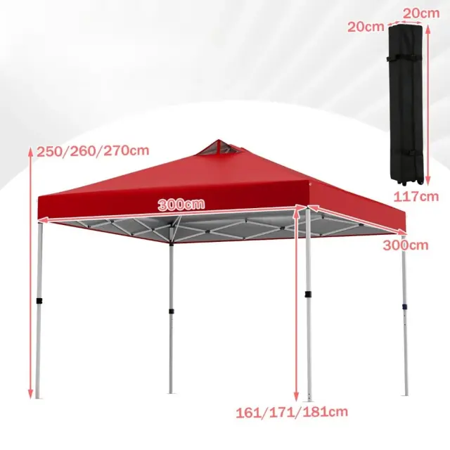 Velikodušnih 9 kvadratnih metrov sence: Izkusite velikodušno pokritost zaradi ravnih nog tega izstopajočega gazeba velikosti 300 x 300 cm, ki zlahka zagotavlja senco za 10-12 oseb. Izbirate lahko med 3 hitro nastavljivimi višinami (250/260/270 cm) z gumbi brez pritiska za vsestransko udobje, kjer koli se postavite.