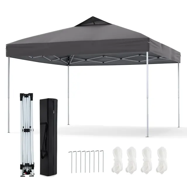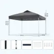 Z velikostjo 295 x 295 x 255-275 cm (D x Š x V) in tristopenjsko nastavitvijo višine je naš pop-up gazebo idealen za različne dejavnosti na prostem. Ponašajo se z inovativnim mehanizmom za zaklepanje z eno roko, ki omogoča hitro in enostavno sestavljanje in razstavljanje. Ko ga ne uporabljate, ga lahko preprosto zložite v prenosno torbo za prenašanje. Za večjo stabilnost in varnost je gazebo opremljen z 8 kovinskimi kavlji in 4 vetrovnimi vrvmi ter prezračevalno režo na vrhu, ki zmanjšuje pritisk vetra in zagotavlja varen zunanji prostor. Poleg tega je gazebo izdelan iz visokokakovostne tkanine Oxford s srebrnim premazom, ki zagotavlja odlično zaščito pred soncem in dežjem ter je zelo trpežna (opomba: ne uporabljajte ga v močnem dežju ali močnem vetru).