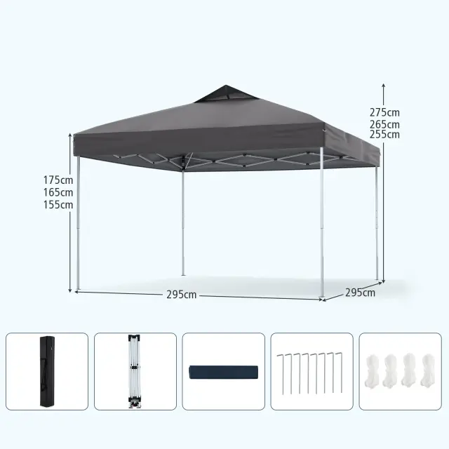 Velika senčna površina: S prostorno pokrito površino 295 x 295 x 255-275 cm (D x Š x V) ta instantni zunanji gazebo zagotavlja veliko sence za vaša srečanja. Ponuja tudi tri enostavno nastavljive višine (255/265/275 cm), da se prilagodite svojim potrebam in uživate v večjem udobju pod velikodušno senčno površino.
