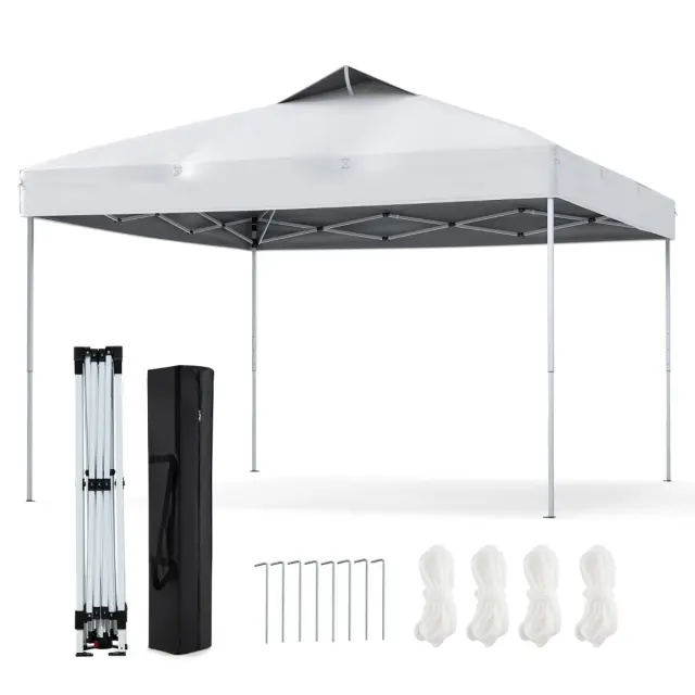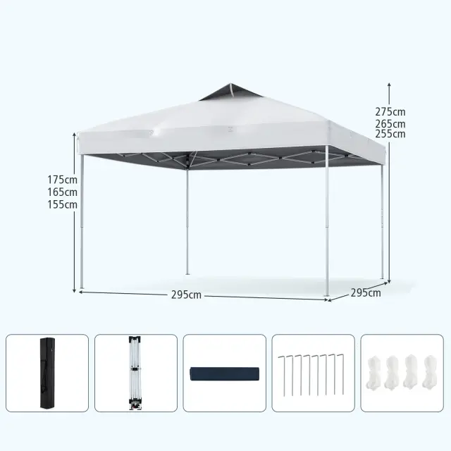 Velika senčna površina: S prostorno pokrito površino 295 x 295 x 255-275 cm (D x Š x V) ta instantni zunanji gazebo zagotavlja veliko sence za vaša srečanja. Ponuja tudi tri enostavno nastavljive višine (255/265/275 cm), da se prilagodite svojim potrebam in uživate v večjem udobju pod velikodušno senčno površino.