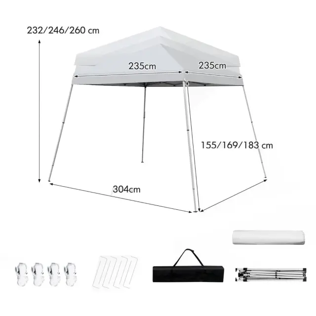 Nastavljiva višina in veliko prostora: Gazebo z nadstreškom meri 304 x 304 x 232-260 cm (D x Š x V) in zagotavlja 5,4㎡ senčnega pokrova, zato lahko s prijatelji ali družino uživate v udobnem preživljanju prostega časa na prostem. Poleg tega lahko višino nastavite v treh položajih (232 cm, 246 cm, 260 cm), da zadostite različnim potrebam.