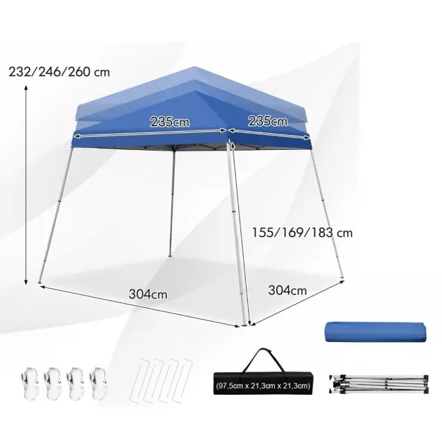Nastavljiva višina in veliko prostora: Gazebo z nadstreškom meri 304 x 304 x 232-260 cm (D x Š x V) in zagotavlja 5,4㎡ senčnega pokrova, zato lahko s prijatelji ali družino uživate v udobnem preživljanju prostega časa na prostem. Poleg tega lahko višino nastavite v 3 položaje (232 cm, 246 cm, 260 cm), da ustreza različnim potrebam.