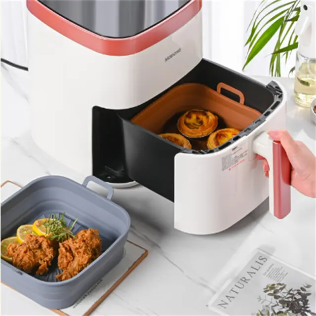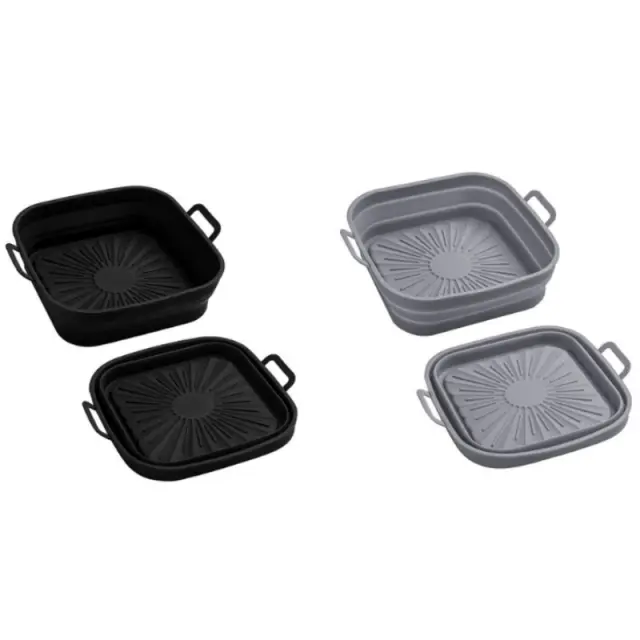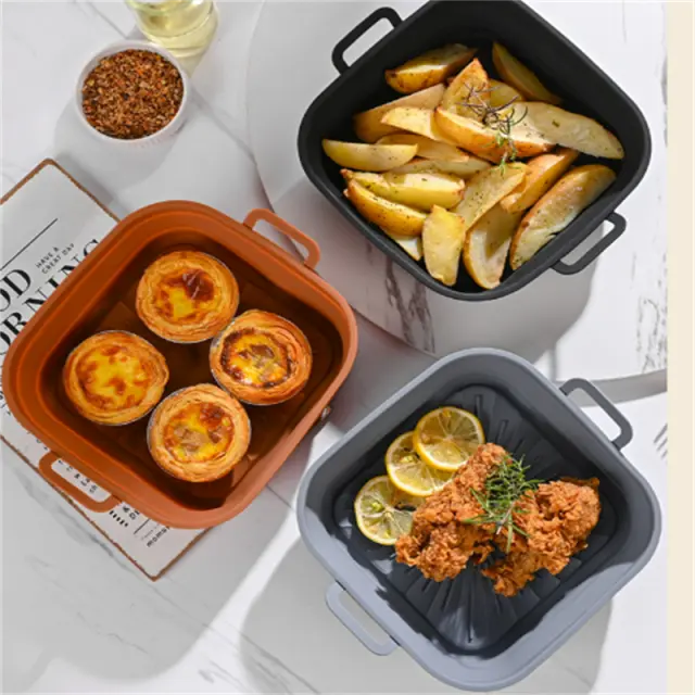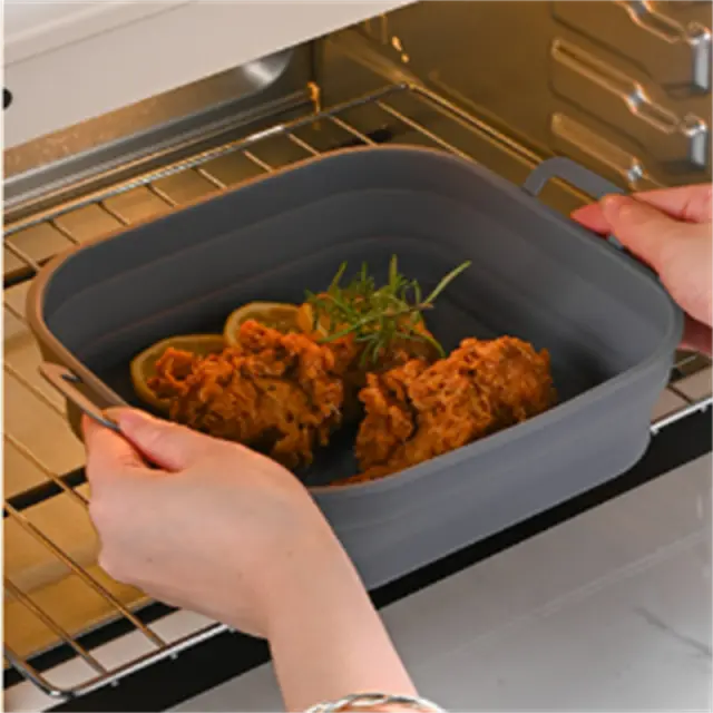Kvadratna oblika silikona, odobrenega za hrano. Popolnoma se prilega cvrtniku in preprečuje lepljive in zažgane ostanke hrane v vašem Air Fryerju. Posoda je za večkratno uporabo in pralna v pralnem stroju. Dvignjen rob drži hrano na mestu in ujame drobtine in odvečno maščobo. Obliko je mogoče stisniti, tako da zavzame manj prostora, ko ni v uporabi.