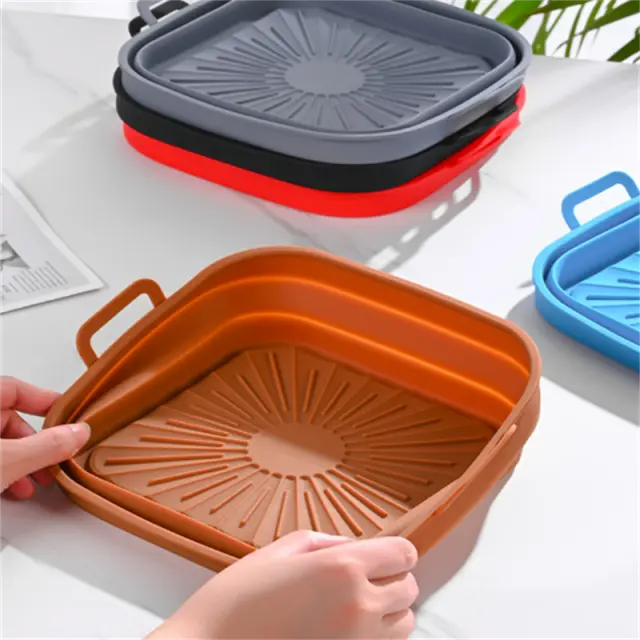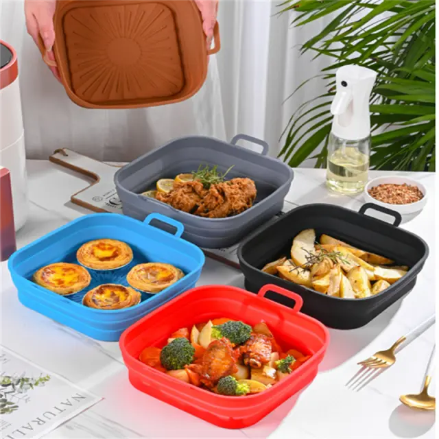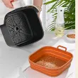 Kvadratna oblika silikona, odobrenega za hrano. Popolnoma se prilega cvrtniku in preprečuje lepljive in zažgane ostanke hrane v vašem Air Fryerju. Posoda je za večkratno uporabo in pralna v pralnem stroju. Dvignjen rob drži hrano na mestu in ujame drobtine in odvečno maščobo. Obliko je mogoče stisniti, tako da zavzame manj prostora, ko ni v uporabi.