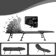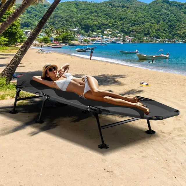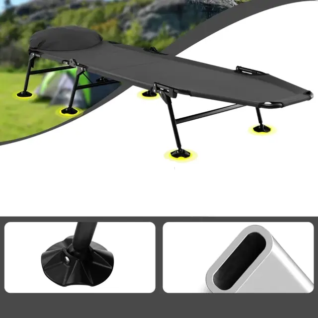 Pokrovi za noge, ki se ne potopijo, in široka uporaba: Zložljiva postelja za kampiranje je na dnu opremljena s 360° vrtljivimi pokrovi za noge, ki preprečujejo, da bi se postelja pogreznila v blato ali rahlo zemljo, hkrati pa ji zagotavljajo stabilnost. Zato je primerna za travo, gozd, plažo, jezero, avtodom, vrt, teraso, dnevno sobo, spalnico, pisarno ali kateri koli drug prostor, kjer želite počivati.