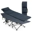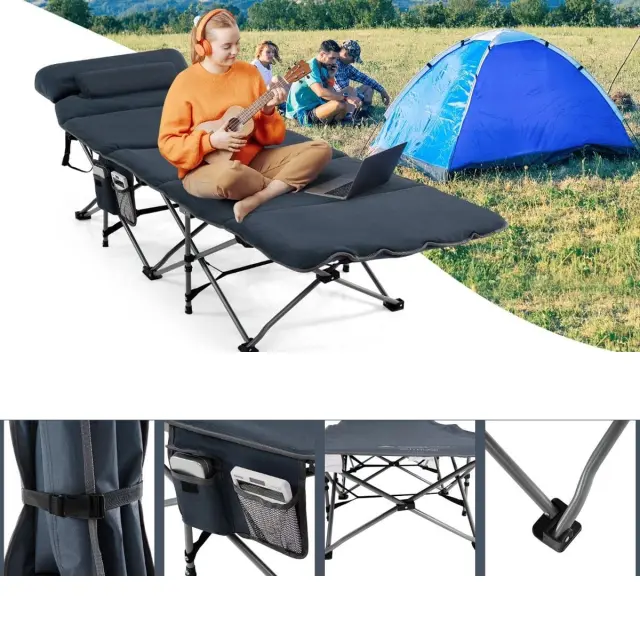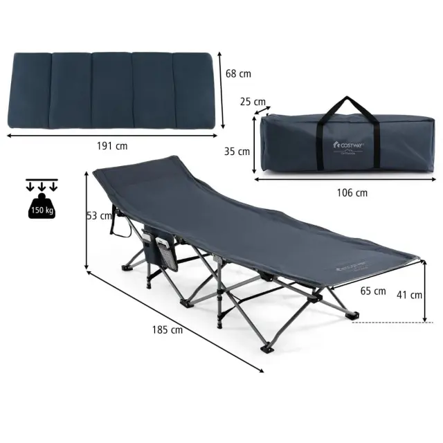 Enostavna postavitev zložljive postelje: Ta zložljiva postelja ne zahteva montaže in je zasnovana tako, da vam sprosti roke in prihrani čas. Vse, kar morate storiti, je, da sprostite trakove za razgrnitev posteljnega okvirja in hitro dobite posteljo za kampiranje na prostem. Posteljni okvir je enostavno zložljiv in ga lahko v nekaj sekundah shranite v torbi za shranjevanje, ki jo zagotavljamo, da ga boste lahko preprosto prevažali.