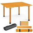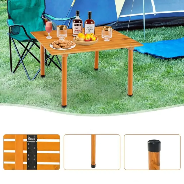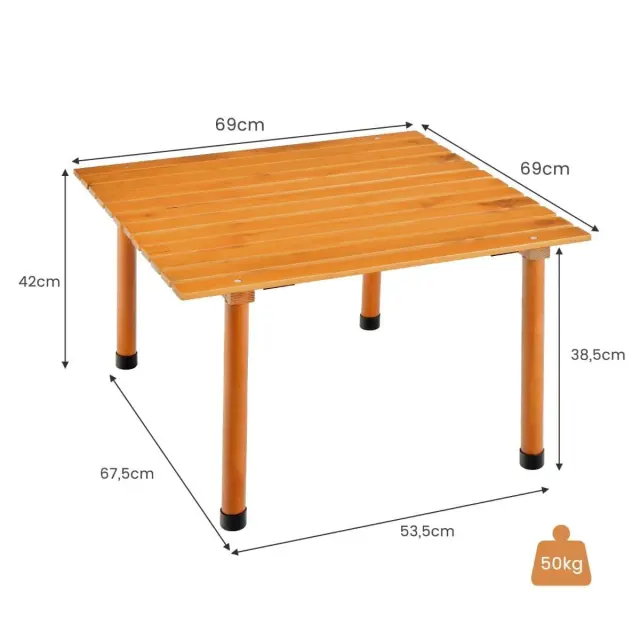 To zložljivo mizo za kampiranje morate imeti, če se želite sprostiti z družino in prijatelji! Lesena taborniška miza je izdelana iz naravnega jelkinega lesa, ki je trden, odporen na obrabo in vzdržljiv. Prav tako je vodoodporna, zato jo je enostavno vzdrževati. Njena prostorna mizna plošča meri 69 x 69 cm, zato je res dobra izbira za piknik. Zložljivo mizo za piknik podpirajo štiri debele lesene noge, nosi pa lahko do 50 kg. Na voljo so tudi prevleke za zaščito nog, ki preprečujejo njeno pogrezanje na zunanjih površinah in ščitijo vaša tla. Najbolj presenetljiva je zasnova mizne plošče, ki jo je mogoče zvijemo za lažje zlaganje. Nato morate le odstraniti noge in prečke ter vse dele shraniti v prenosno torbo. Ne glede na to, ali imate piknik, kampirate ali se srečujete na prostem, je to pametna izbira.