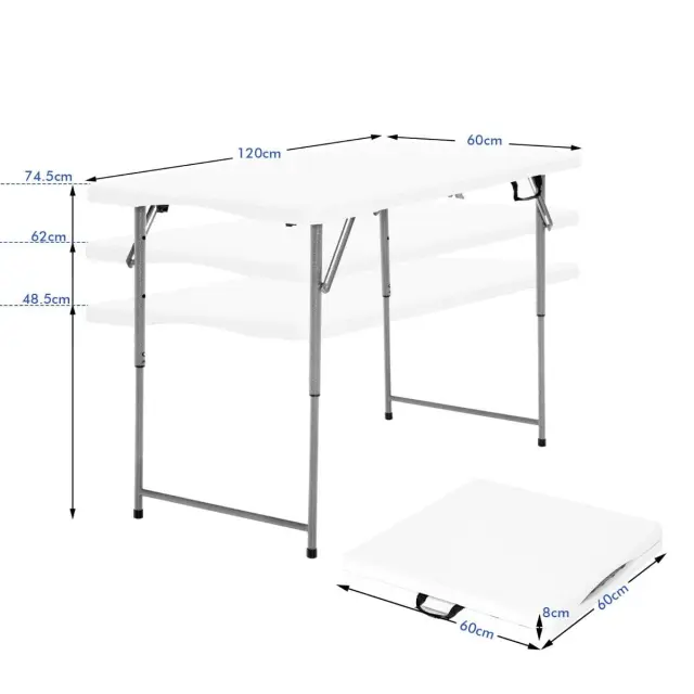 3-stopenjska nastavitev višine: Ta zložljiva miza je opremljena s 4 nogami z nastavljivo višino, ki jih lahko brez težav nastavite v 3 različne položaje. Višino te mize lahko prilagodite na 48,5 cm, 62 cm ali 74,5 cm, da bo primerna tako za otroke kot odrasle.
