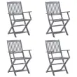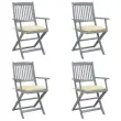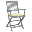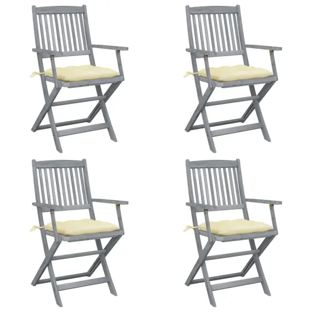 Ta komplet sodobnih vrtnih jedilnih stolov z blazinami bo na vaš vrt, teraso ali dvorišče dodal pridih naravnega čara. Ta komplet zložljivih vrtnih stolov je odlična izbira za večerjanje. Ti jedilni stoli so izdelani iz trdnega akacijevega lesa, tropskega trdega lesa, ki zagotavlja vodoodpornost in dolgotrajno vzdržljivost. Trden akacijev les je dovolj močan za prenašanje teže ter se dobro spopada z obrabo in uporabo. Siva sprana površina je preprosta za čiščenje z vlažno krpo. Stole lahko zložite in tako prihranite prostor, ko niso v uporabi. Priložene blazine zagotavljajo dodatno udobje med počivanjem ali večerjanjem. Vsaka blazina ima dva kompleta vrvic za dobro pritrditev na stol.Barva blazine: Kremno belaMaterial stola: Trden akacijev les (brušen) s sivim premazomMaterial blazine: Blago (100 % poliester)Dimenzije stola: 54 x 57 x 91 cm (Š x G x V)Dimenzije blazine: 40 x 40 x 7 cm (D x Š x V)Globina sedeža: 39 cmVišina sedeža od tal: 45 cmZložljiva oblikaZ 2 kompletoma vrvic za pritrditev blazine na sedežPotrebno sestavljanje: DaPaket vsebuje:4 x Zložljiv stol4 x Blazina za sedež Največ 110 kg na sedež.