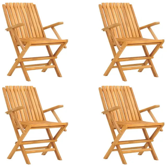 Uživajte v prijetnem preživljanju prostega časa z družino in prijatelji na prostem na teh lesenih zložljivih vrtnih stolih! Trdna tikovina: Trdna tikovina je čudovit naravni material. Je sušena na zraku, sušena v peči in nato fino brušena za pridobivanje gladkega videza. Tikovina je znana po svoji izjemni moči in vremenski odpornosti.Zložljiva funkcija: Vrtni stol lahko zložite, da prihranite prostor, ko ta ni v uporabi.Udobna izkušnja: Naslonjalo za hrbet in nasloni za roke vrtnih sedežev vam nudijo odlično oporo in zagotavljajo optimalno udobje.Zasnova z letvicami: Zunanji sedež z letvicami je videti preprosto in brezčasno. Opomba:Če želite, da vaše zunanje pohištvo ostane lepo, vam priporočamo, da ga zaščitite z vodoodporno prevleko.Dobro je vedeti:Za čim lažjo montažo je vsakemu izdelku priložen priročnik.Material: Trdna tikovina s premazom na vodni osnoviDimenzije (vsak): 61 x 67 x 90 cm (D x Š x V)Velikost sedeža: 36 x 42 cm (Š x G)Višina sedeža od tal: 45 cmMaksimalna nosilnost (na sedež): 110 kgPaket vsebuje:4 x Zložljiv vrtni stol Največ 110 kg na sedež.