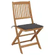 Ti zložljivi stoli z blazinami iz trdnega akacijevega lesa zagotavljajo popoln prostor za sproščanje ter prijetno sončenje na vaši terasi ali vrtu. Ti vrtni stoli so izdelani iz trdnega akcaijevega lesa, zato so vzdržljivi in stabilni. Trden akacijev les je dovolj močan za prenašanje teže, dobro pa se spopada tudi z obrabo in uporabo. Ti zunanji stoli zagotavljajo več let sproščanja. Stole lahko zložite in tako prihranite prostor, ko niso v uporabi. Priložene blazine nudijo dodatno udobje. Vsaka blazina ima dva kompleta vrvic za pritrditev na stol.Barva blazine: AntracitnaMaterial stola: Trden akacijev les z oljnim premazomMaterial blazine: Blago (100 % poliester)Dimenzije stola: 48,5 x 57 x 91 cm (Š x G x V)Dimenzije blazine: 40 x 40 x 3 cm (D x Š x V)Zložljiv stolZ 2 kompletoma vrvic za pritrditev blazine na sedežPotrebno sestavljanje: DaPaket vsebuje:2 x Zložljiv stol2 x Sedežna blazina Največ 110 kg na sedež.