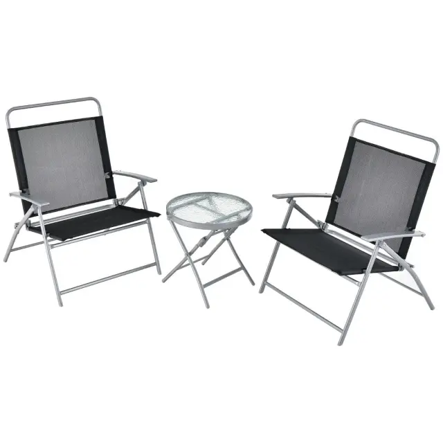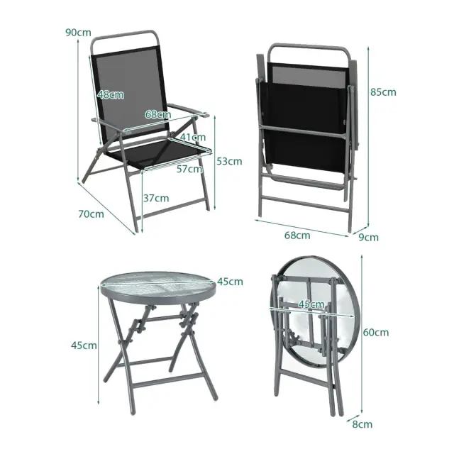 Prenosni set za teraso: Zahvaljujoč hitremu zlaganju mize in stolov je ta set za teraso enostaven za shranjevanje in prevoz. Zaponke za pritrditev učinkovito preprečujejo nenamerno zlaganje. Takšen prenosni set stolov na prostem je idealen dodatek za dvorišče, območje z bazenom, sprednjo verando itd.