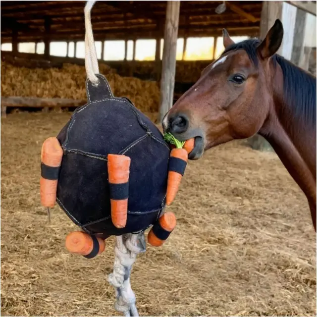Upočasnjeno hranjenje: Ta žoga za hranjenje spodbuja upočasnjeno hranjenje z izdajanjem majhnih porcij korenja, kosa sena ali priboljškov, ko konj z njo sodeluje. Deluje kot hranilnik priboljškov in igrača za obogatitev okolja ter zmanjšuje dolgčas in spodbuja naravno iskanje hrane v hlevu. Primerna je za uporabo med treningom, pripravo na pašo ali vsakodnevnimi rutinskimi aktivnostmi za konje, ki imajo koristi od upravljanih intervalov hranjenja in interaktivnih izzivov.