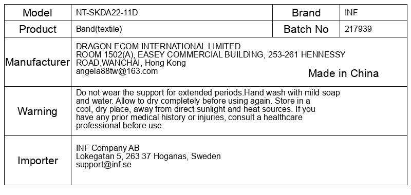 Podpore ne nosite dlje časa. Ročno umivanje z blagim milom in vodo. Pred ponovno uporabo pustite, da se popolnoma posuši. Hraniti na hladnem in suhem mestu, stran od neposredne sončne svetlobe in virov toplote. Če imate predhodno zdravstveno anamnezo ali poškodbe, se pred uporabo posvetujte z zdravstvenim delavcem.