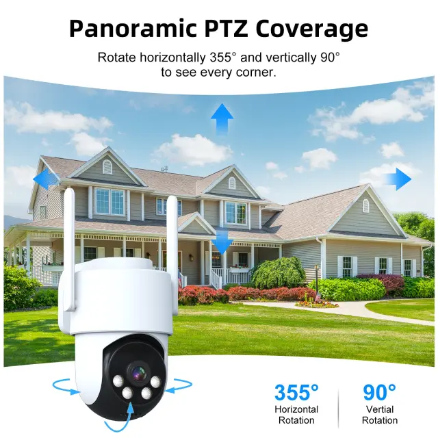 Odporna na vremenske vplive in vsestranska: Ta vodoodporna kamera IP65, zasnovana za zunanjo uporabo, lahko prenese težke vremenske razmere, kar zagotavlja zanesljivo delovanje skozi vse leto. Njena funkcija panoriranja, nagibanja in povečave (PTZ) omogoča daljinsko upravljanje vidnega kota kamere, kar zagotavlja 355° horizontalno in 90° vertikalno rotacijo. Zaradi te vsestranskosti je idealna za spremljanje velikih območij, kot so parkirišča, gradbišča ali kmetije. Vodoodporna konstrukcija kamere zagotavlja, da lahko prenese dež, sneg in ekstremne temperature, kar zagotavlja neprekinjen nadzor ne glede na okolje. Funkcija PTZ omogoča dinamično prilagajanje vidnega kota, kar zagotavlja, da se lahko vedno osredotočite na območja, ki vas zanimajo.