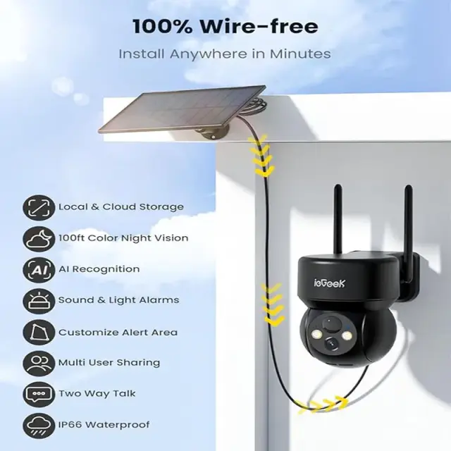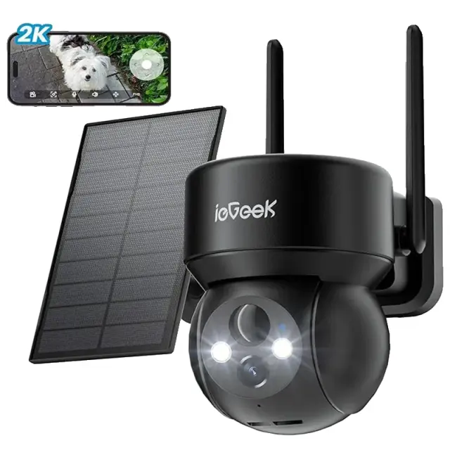• Možnosti solarne in baterijske napajanja: ieGeek 360° brezžična solarna kamera ima 5200mAh polnilno baterijo v kombinaciji s sončnimi paneli, kar zagotavlja neprekinjeno napajanje brez zapletenega ožičenja, kar omogoča udobje in prilagodljivost pri namestitvi.