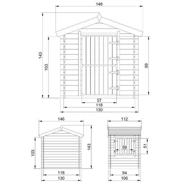 - Zunanje mere brez strehe: D130 x Š106 cm