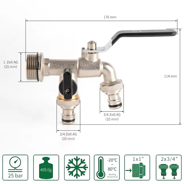Bakreno kroglično jedro ventila: Pipa je opremljena z bakrenim krogličnim jedrom ventila, ki zagotavlja gladek in učinkovit pretok vode z minimalnim uporom. Jedro ventila zagotavlja tudi odlično odpornost proti rji, sončni svetlobi, visokim temperaturam in koroziji.