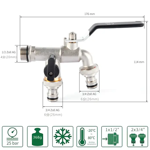 Bakreno kroglično jedro ventila: Pipa je opremljena z bakrenim krogličnim jedrom ventila, ki zagotavlja gladek in učinkovit pretok vode z minimalnim uporom. Jedro ventila zagotavlja tudi odlično odpornost proti rji, sončni svetlobi, visokim temperaturam in koroziji.