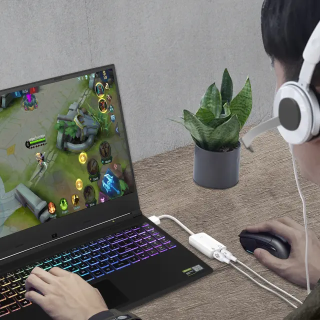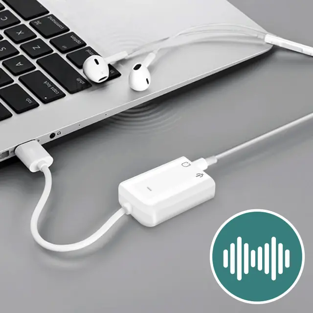 Zunanja USB zvočna kartica za vaš prenosnik, Macbook, TV.. Omogoča zamenjavo poškodovanih ali slabe kakovosti 3,5 mm avdio vhoda. Istočasno priključite mikrofon in slušalke/zvočnike. Med igranjem se pogovarjajte s prijatelji, snemajte poddaje, opravljajte video klice..