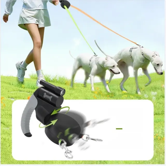 Nočna vidljivost: Vgrajena LED lučka zagotavlja ciljno osvetlitev za varnejše večerne in jutranje sprehode ter je vgrajena v dvojni pasji povodec, da vam pomaga videti okolico in biti vidni drugim. Osvetljen zložljiv pasji povodec izboljša vidljivost v bližini cest, poti in temnih poti ter zmanjša stres pri hoji v temi. LED lučka deluje na baterije, za katero je potrebna ena baterija AAA (ni priložena), in je zasnovana tako, da zagotavlja zanesljivo svetlobo za kratke nočne sprehode, medtem ko samodejni zložljivi mehanizem še naprej gladko upravlja oba psa.