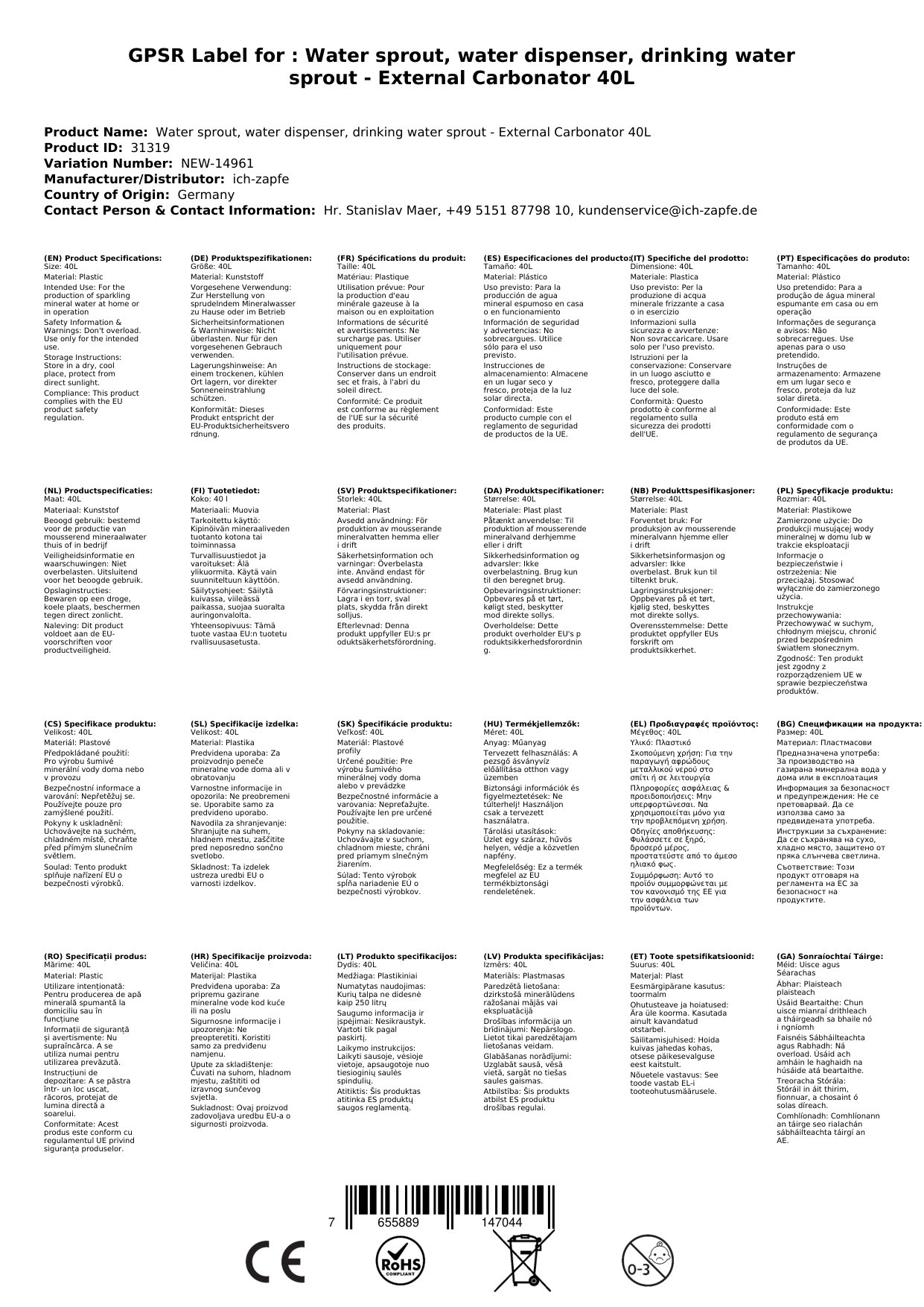 Mere naprave (166 x 344 x 370 mm) in teža 10,5 kg omogočajo enostavno postavitev tudi v omejenih prostorih. Kot alternativa klasičnim steklenicam zmanjšuje odpadke in stroške, hkrati pa zagotavlja okolju prijazno rešitev. Priključite ga na vaš hlajilni sistem in pipo, in takoj boste imeli dostop do kakovostne špiritualne vode.